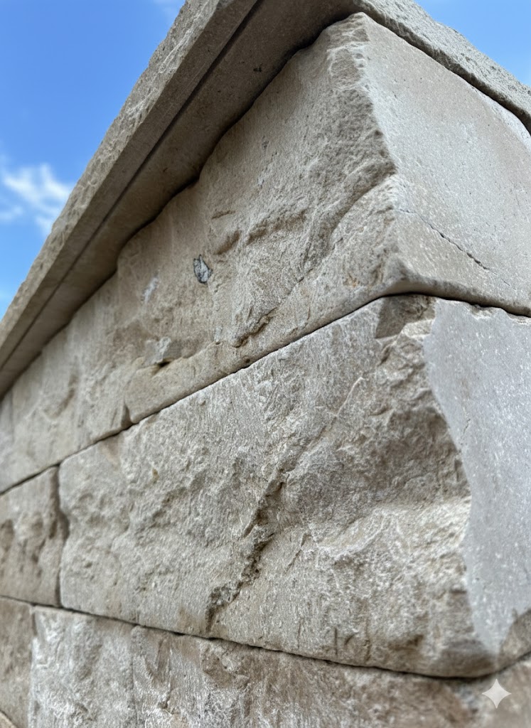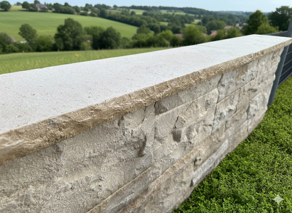 Kalkstein ist ein Naturprodukt. Farbvariationen und feine Strukturen sind materialbedingt und unterstreichen den einzigartigen Charakter jeder Mauerabdeckung.